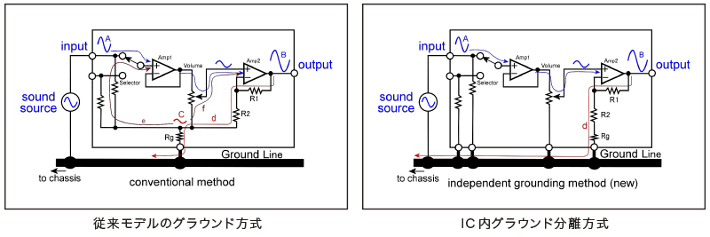 プリアンプIC内の各ステージのすべてのグラウンドをIC外に引き出し、ディスクリート構成と同じようにアンプとしてグラウンド処理を行う新しい方式を採用。