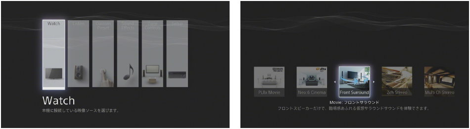 入力の切り替えや設定変更を画面上で快適に行えるGUIデザインを採用。Watch、Listenなど目的別のわかりやすいメニュー構成になっています。聴きたいソースや使いたい機能の選択が簡単にできるなど、感覚的に操作・設定できます。コンテンツを再生しながらサウンドエフェクトの変更などが可能です。