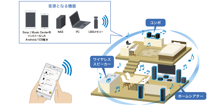 ※ スマートフォン/タブレットで操作したり、本体に格納した音楽データを再生するには、最新バージョンの「Music Center」アプリのインストールが必要です。
