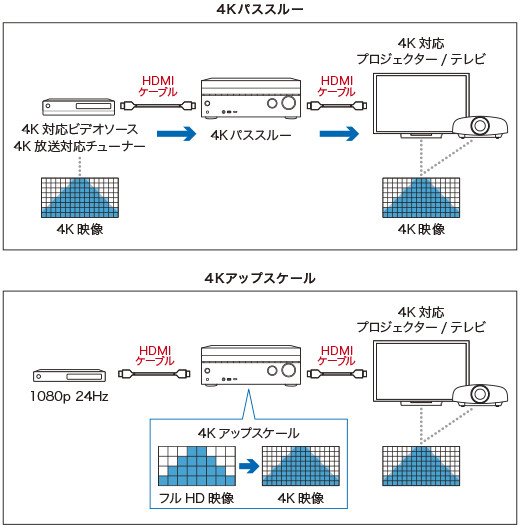 HDMI入力は3D映像信号や4K映像に加え、すべてのHDMI入出力が4K放送(最新の著作権保護技術HDCP 2.2)に対応。HDMI新規格のHDR映像やBT.2020映像、4K/60p 4:4:4映像信号など、さまざまな映像機器からの18Gbpsまでの4K信号をパススルーし、4K対応テレビやプロジェクターなどへそのまま信号を出力できます。また、HDMI入力映像を4K信号にアップスケールしてHDMI出力できる「4Kアップスケール」機能も採用。従来のアナログ映像をよりなめらかで奥行きのある映像で楽しめます。