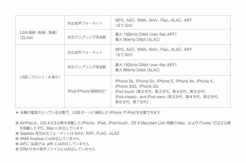 iPhoneなどのiOS端末の音楽データをワイヤレスで受信し、高音質で再生できる「AirPlay」に対応。Wi-Fi内蔵と合わせ、配線なども不要で手軽にiPhoneの音楽を高音質で楽しめます。