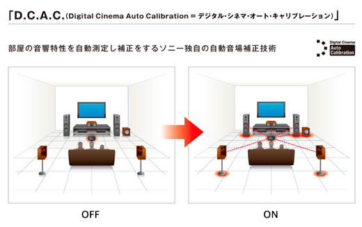 「アドバンストD.C.A.C.」は、ソニー独自の高速精密測定信号を使い、測定が30秒で行う事で、周波数特性補正カーブを生成すると同時に、部屋の形が原因の不要な反射音も同時に除去してしまいます。このため開放的でクセのない再生環境を作り出します。アドバンストD.C.A.C.の特長は、精度の高いインパルス応答測定を元にした、「A.P.M.」です。サラウンド、サラウンドバック、センターの位相の周波数特性をフロントL/Rの特性に合わせることで、全てのチャンネルに同じスピーカーを使った時と同等のつながりの良いサラウンド空間を得ることができます。