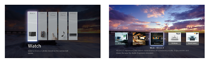 入力の切り替えや設定変更を画面上で快適に行えるGUIデザインを採用。Watch、Listen など目的別のわかりやすいメニュー構成になっています。聴きたいソースや使いたい機能の選択が簡単にできるなど、よ感覚的に操作・設定できます。さらに、コンテンツを再生しながらサウンドエフェクトの変更などが可能なオーバーレイ表示に対応し、これまで以上に操作性を向上しました。