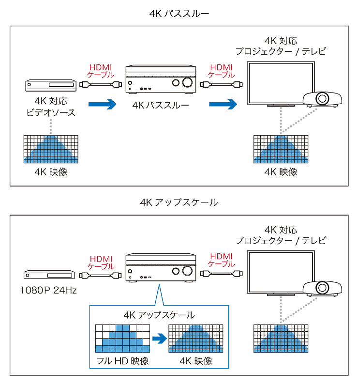 HDMI入力は、これまでの3D映像信号に加えて、4K映像にも対応(*1)。映像機器からの4K信号をパススルーし、4K対応のテレビやプロジェクターなどへそのまま信号を出力できます。また、フルHDの入力信号を4K信号にアップスケールしてHDMI出力できる「4Kアップスケール」機能も採用。従来のアナログ映像をよりなめらかで奥行きのある映像で楽しめます。