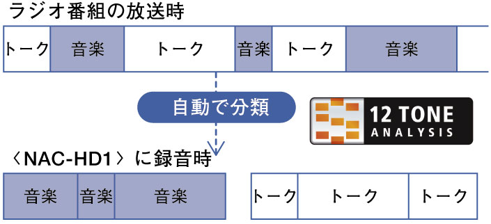 FM/AMチューナー内蔵なので、ラジオ番組の受信や録音が手軽に行えます。録音時には、ラジオ番組の「音楽部分」と「トーク部分」を自動で分類。もちろん、自動分類をしない通常のラジオ録音もできます。タイマー録音の登録は最大10件まで対応。毎日・曜日指定・日付指定などの設定もできます。