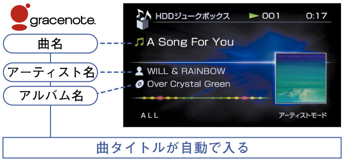 HDD内には、約35万ものアルバムタイトル情報を収録。曲タイトルが自動で入力されます。最新のタイトル情報もインターネット経由で自動取得。また、カセットテープなどのアナログ外部音源や、CSチューナーなどのデジタル入力からの外部音源でも、波形データから曲を識別し、曲タイトルの自動入力が可能(*)。手間をかけることなく、大量の楽曲データを整理できます。