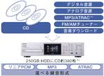ATRACやMP3(*1)のほか、リニアPCM録音に対応。CDの音楽情報を非圧縮で高音質のままHDDに記録できます。内蔵するCDプレーヤーやFM/AMチューナーのほか、アナログ入力やデジタル入力に接続した機器からも録音可能。たとえば、衛星デジタル放送のリニアPCM音楽番組も録音できます(*2)。250GBのHDDに、最大40,000曲(*3)、リニアPCMでもCD約380枚分(*4)の曲をストックできるので、たくさんコレクションした音楽CDを、まとめて収録できます。