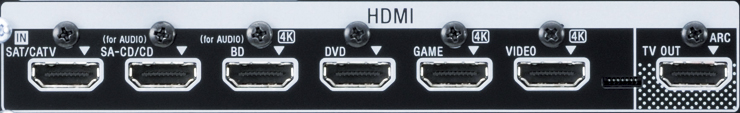 HDMI入力端子は6系統搭載。高音質性能を高めた入力「for AUDIO」(*1)を2系統備え、BDやスーパーオーディオCDの高音質ソースをクオリティーの高い状態で再生できます。HDMI出力端子は1系統を装備。ON、OFFの出力切替えができます。このほか、HDMI信号も「トリルミナスカラー」(*2)、「Deep Color」(*3)、フルHD・1080pや4Kの高精細デジタル映像信号にも対応しています。