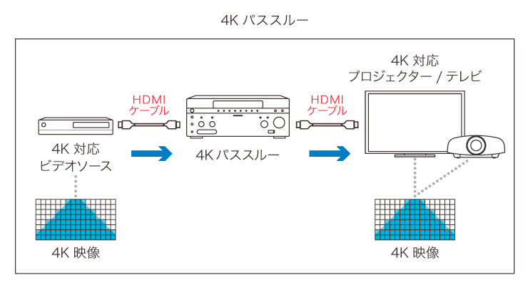 HDMI入力は、これまでの3D映像信号に加えて、4K映像にも対応(*2)。映像機器からの4K信号をパススルーし、4K対応のテレビやプロジェクターなどへそのまま信号を出力できます。