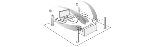これは、サラウンド再生の基本的な構成である5.1chに、左右のフロントスピーカーの上方にスピーカーを配置することで、前後左右に加えて高さ方向の音場表現を可能にするもの。音場再現に高さ方向が加わることで、音場の立体感がより高まり、さらに臨場感豊かなサラウンドが再生できます。また、従来のサラウンドバックチャンネルを配置した7.1chサラウンド方式での再生も可能です。