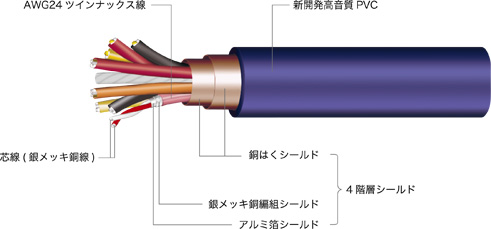●アルミ箔+銅編組+銅箔+銅箔の4階層シールド構造により不要なノイズを極限まで低減。ノイズによる信号の乱れ、ジッタを防ぎ優れた伝送特性を実現