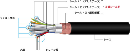 2つの芯線をドレイン線とともにツイストする構造により外来ノイズの影響を低減。3重シールド構造により遮蔽性を向上