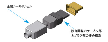 ケーブル部とプラグ部の接合部は、外来ノイズの影響を受けやすい部分のため、プラグ部内部に金属シールドシェル構造採用することで外来ノイズの影響を低減し、高遮蔽性を実現。