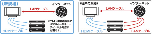 映像/音声信号に加えて100Mbpsのデータ通信が1本のHDMIケーブルで伝送できます。これにより、テレビなど1台のHDMIイーサネットチャンネル対応の機器がネットワーク接続をされていれば、その他のHDMIイーサネットチャンネル対応のブルーレイディスクレコーダーなどからもネットワーク利用が可能になります。