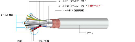 遮蔽性を向上させるため、ツイスト構造の2本と芯線とドレイン線をアルミテープでシールドし、そのシールドを含む全ての信号線をまとめてアルミテープでシールド。さらにその外側を編組銅線でシールドした3重シールド構造。