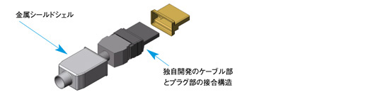 ケーブル部とプラグ部の接合部は、外来ノイズの影響を受けやすい部分のため、プラグ部内部に金属シールドシェル構造採用することで外来ノイズの影響を低減し、高遮蔽性を実現。
