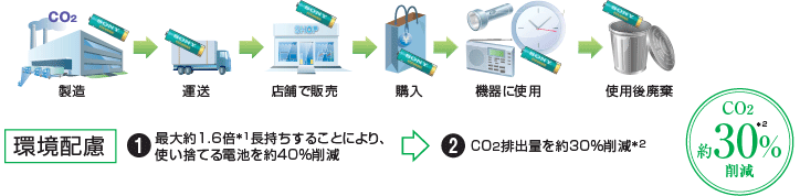 *2当社従来比最大(単3形の場合)。電池1本の生産に必要なCO2排出量は容量アップのため従来品に比べ増えますが、デジタルカメラを想定したIEC測定条件(1500mW×2sec, 650mW×28sec, 5min/h終止1.05V)では電池使用本数が約37%減になり、約30%のCO2排出量削減になります。