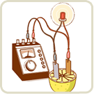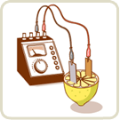 レモンを半分に切り、切り口に銅板と亜鉛板を差し込む。