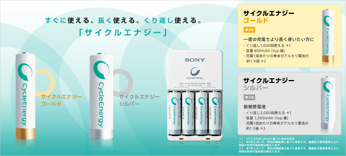 くりかえし使えて経済的な充電池「サイクルエナジーシルバー」(充電済み)