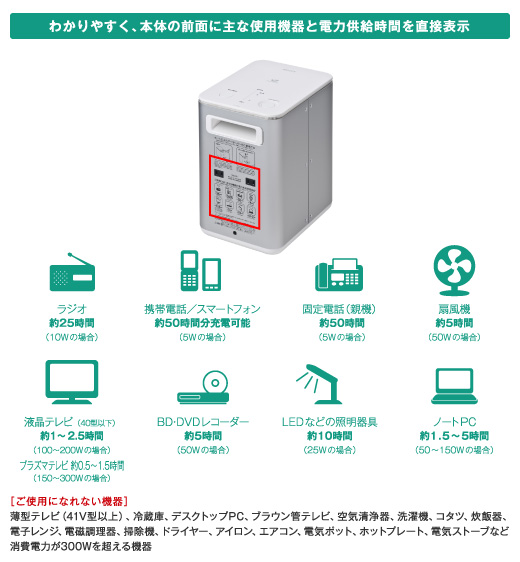 *2 ご使用可能時間はACコンセント1口のみ使用の場合、記載した電力供給時間は、各機器の想定消費電力に基づく算出値です