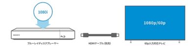 インターレースで収録された映像を、高品位なプログレッシブハイビジョン映像に変換して出力。よりなめらかな映像を楽しめます。ブルーレイディスクに録画されたハイビジョン番組なども1080/60pにして出力します(*)。
