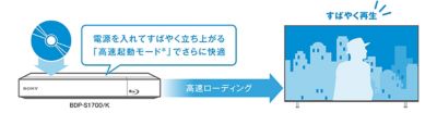 高速ローディング技術により、ディスク挿入後、すばやく再生を開始。膨大なデータ量をもつブルーレイディスクでも、本編が再生されるまでのイライラを解消してくれます。また、電源を入れると、すばやく立ち上がる「高速起動モード(*)」も搭載しています。