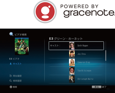 ディスクを挿入すると、ネットワーク上のデータベース(Gracenote)から自動的に関連情報を取得(*)。たとえば映画作品の監督や出演者の名前や関連作品の情報などをテレビ画面に表示します。出演者を選べば、別の出演作の情報が表示されるなど、楽しさが広がる便利なネットワーク機能が利用できます。BD、DVD、CDのソフトに対応。
