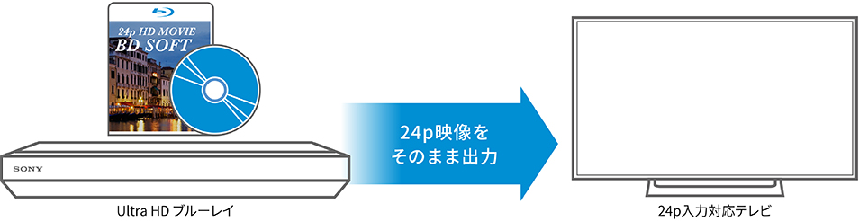 映画のオリジナルフィルムと同じように毎秒24コマのプログレッシブハイビジョン映像(24p)を収録したBDソフトに対応。24p入力に対応したハイビジョンテレビ ブラビアとHDMIケーブル(別売)で接続すれば、24p映像をそのまま出力するので、映画本来の質感で楽しめます。