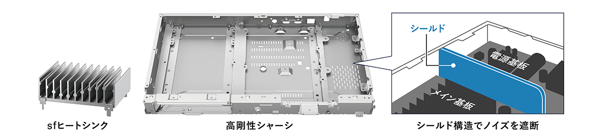 AVアンプでも採用している高剛性シャーシ構造や、メインLSIの上に 独自開発のフィンを付けたsfヒートシンクを採用し、機械的な振動を抑制。