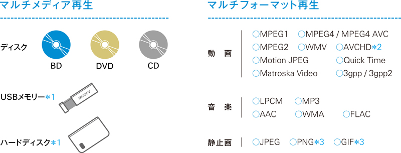 DVDやCDはもちろん、USBメモリー(*1)やパソコン用外付けハードディスク(*1)に保存されたさまざまなフォーマットの動画やJPEG画像も再生。さらには、スーパーオーディオCDの再生もできます。