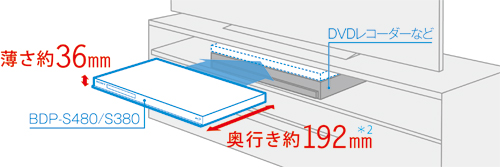 薄さ、わずか約36mm。AVラックなどで他の機器(*1)に重ねてもかさばらずに収納でき、書斎や寝室などの限られたスペースにも、すっきり設置できます。