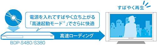 高速ローディング技術により、ディスク挿入後、すばやく再生を開始。膨大なデータ量をもつブルーレイディスクでも、本編が再生されるまでのイライラを解消してくれます。また、電源を入れると、すばやく立ち上がる「高速起動モード(*)」も搭載しています。