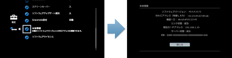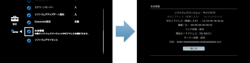 ※ MACアドレス、機器ID、ESNは機器固有の情報であり、機器毎に異なった値になります。(画面の値は例です)