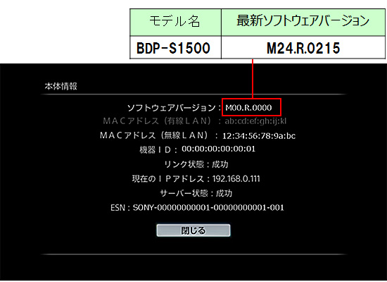 ※ MACアドレス、機器ID、ESNは機器固有の情報であり、機器ごとに異なった値になります。(画面の値は例です)