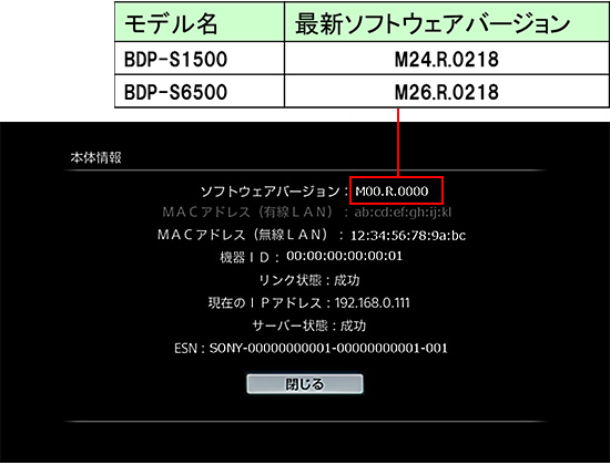 ※ MACアドレス、機器ID、ESNは機器固有の情報であり、機器ごとに異なった値になります。(画面の値は例です)
