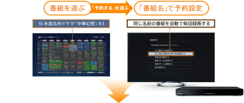 「番組名」を一度設定すれば、以降わずらわしい操作をする必要もなく、その番組を追跡して録画します*2。