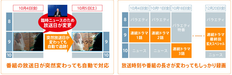 スポーツ中継延長で放送時刻が変わっても、スペシャル特番で放送日が変わっても、大丈夫。