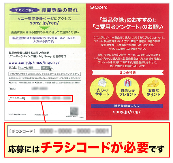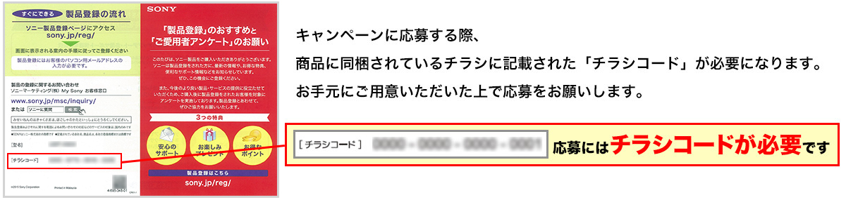 応募には商品同梱の<「製品登録」のおすすめと「ご愛用者アンケート」のお願い>チラシに掲載のチラシコードが必要です
