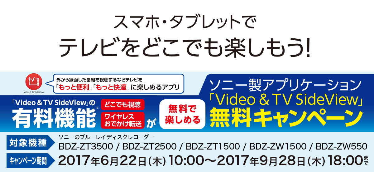 * アプリのご利用には最新の「Video & TV SideView」アプリのインストールおよび通常初回のみ課金(外出先からの視聴時・Android™:463円+税、iOS:556円+税)が必要です。価格は2017年4月30日時点の情報です。