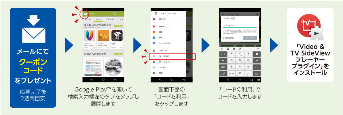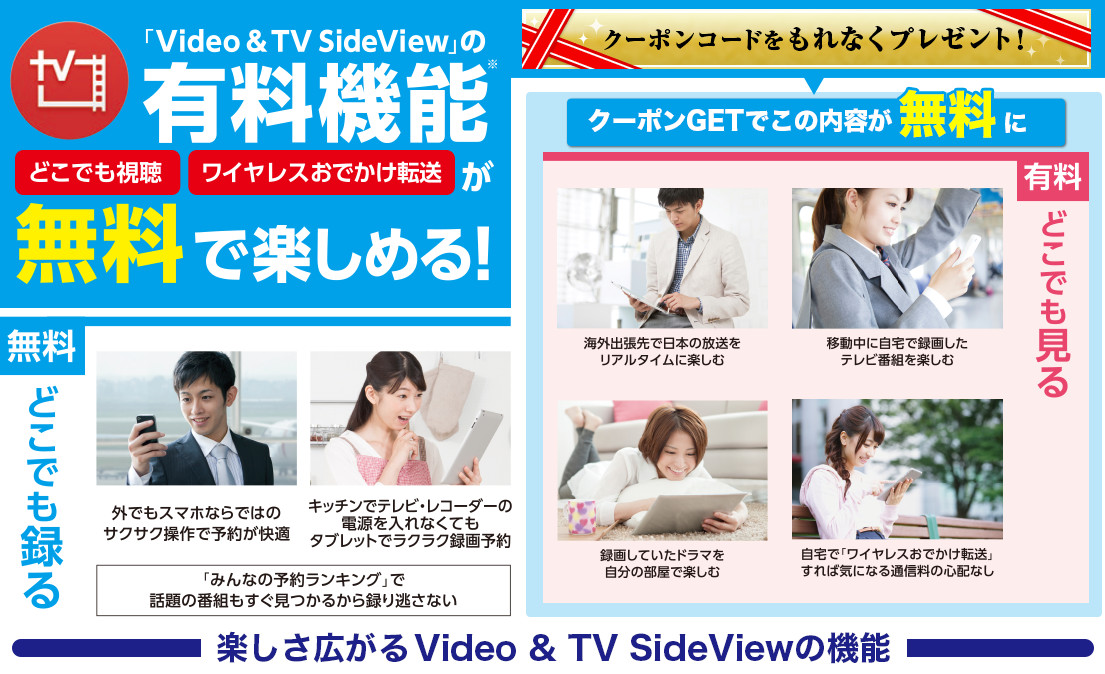 「Video & TV SideView」の有料機能※(どこでも視聴、ワイヤレスおでかけ転送)を無料でお楽しみいただけるクーポンコードを進呈 |