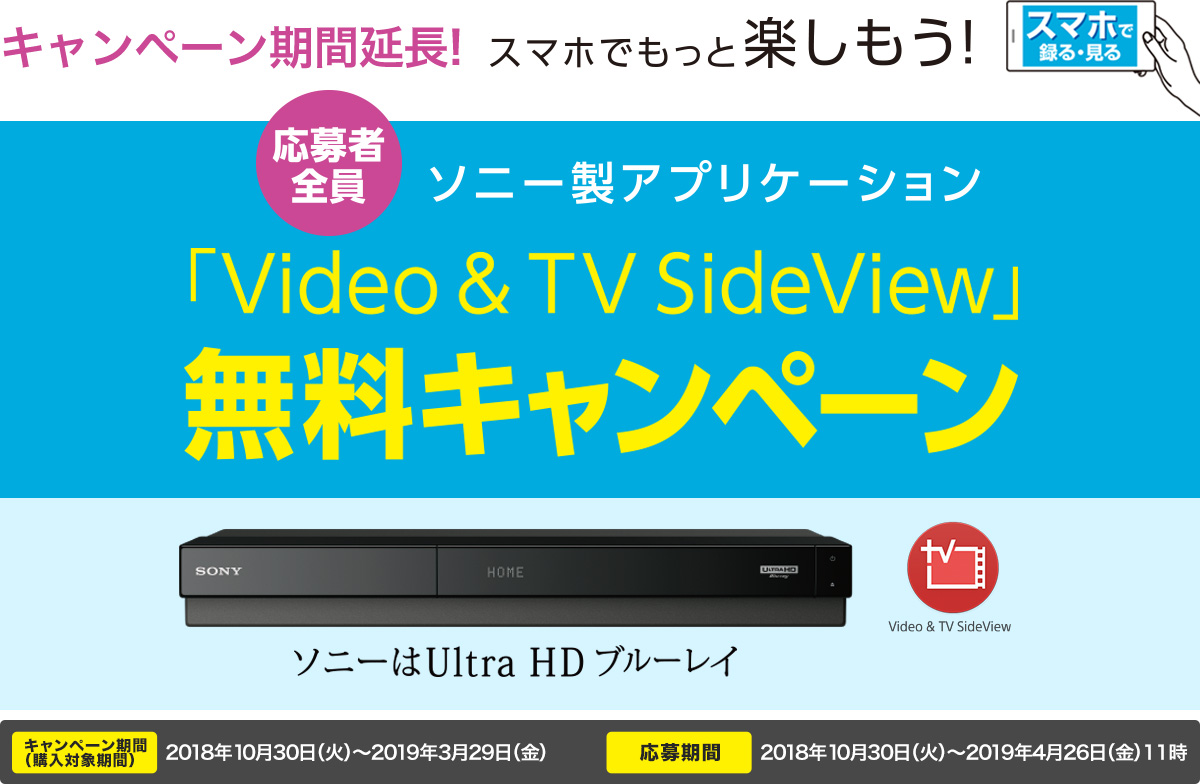 * アプリのご利用には最新の「Video & TV SideView」アプリのインストールおよび通常初回のみ課金(外出先からの視聴時・Android™:463円+税、iOS:556円+税)が必要です。価格は2018年10月時点の情報です。