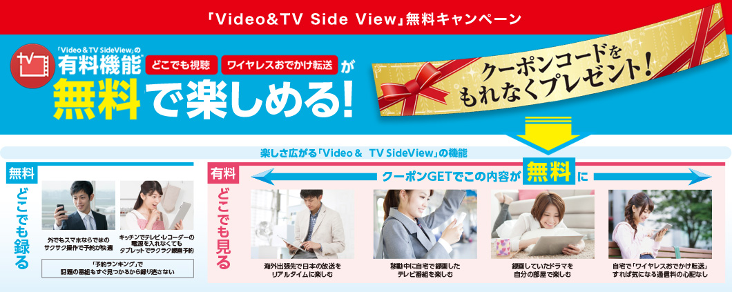 「Video & TV SideView」の有料機能※(どこでも視聴、ワイヤレスおでかけ転送)を無料でお楽しみいただけるクーポンコードを進呈 |