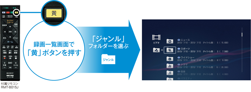 録画一覧画面で、リモコンの「黄」ボタンを押すだけ。番組を映画、アニメ、バラエティなどといったジャンル別や録画予約時に設定したマーク別に自動分類して表示します。また、連続ドラマなど、同じタイトルの番組もひとつのフォルダーにまとめます。