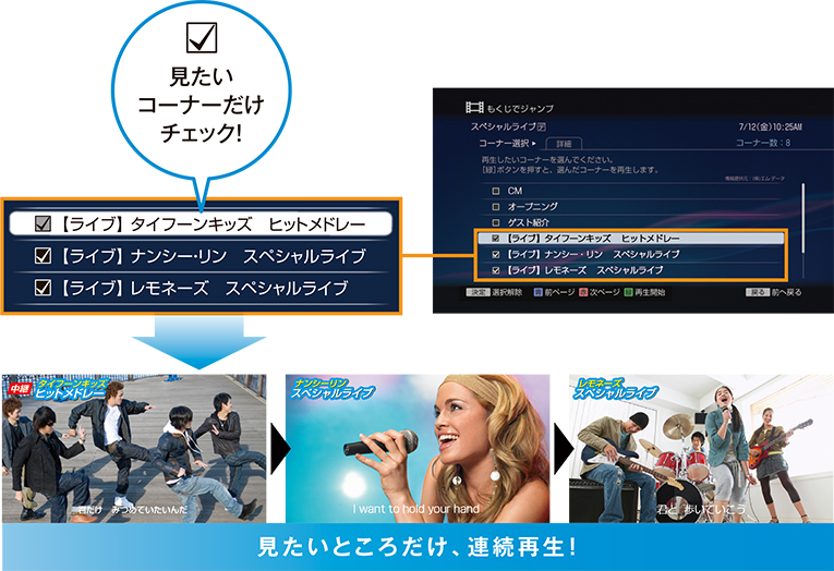 チェックボックスを表示させ、見たいコーナーを複数選択可能に。歌番組などのライブシーンだけを、早送り操作せずに、まとめて見られます。