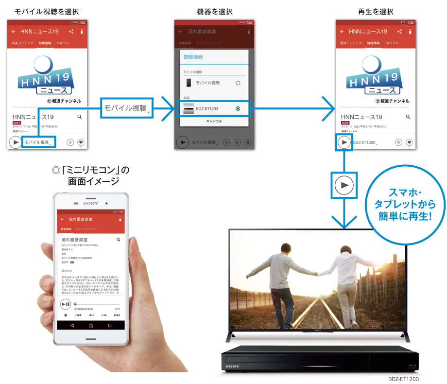 「Video & TV SideView」からの番組再生指示に対応。ブルーレイディスクレコーダーを選択することで、本体にHDMI接続されたテレビで視聴できます。また、再生指示後はミニリモコンからの操作が可能になります。