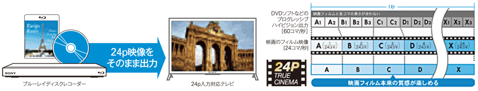 市販のBDソフト(BD-ROM)に収録された、オリジナルフィルムと同じ毎秒24コマのプログレッシブハイビジョン映像(24p)のHDMI出力に対応。24p入力に対応したテレビとHDMIケーブル(別売)で接続すれば、映画本来の質感で楽しめます。