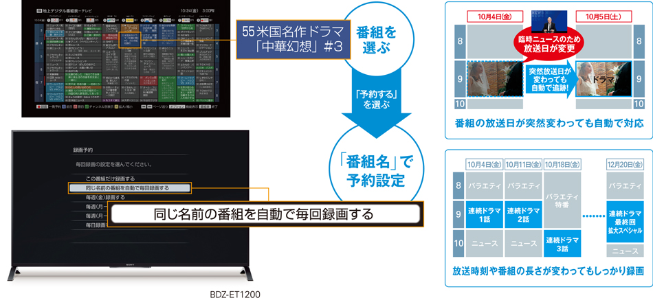 「番組名」を一度設定すれば、以降、その番組を追跡して録画します(*)。スポーツ中継延長で放送時刻が変わっても、スペシャル特番で放送日が変わっても、大丈夫。また、連続ドラマを1話から最終話までしっかり録画したい場合も便利です。