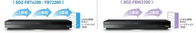外付けハードディスク(HDD)録画する場合の注意:◎複数の外付けHDDを同時に接続することはできません◎ご使用にはレコーダー本体への登録が必要です。あらたに登録し直すと保存されているデータはすべて消去されます◎本機修理にともない、内蔵HDD同様に外付けHDDも初期化が必要になる場合があります。ブルーレイディスクなどにダビングしておくことをおすすめします※ その他モデルの注意点など、詳しくはソニーブルーレイディスクレコーダーサポートページをご覧ください*1 外付けハードディスクへ2番組以上同時に録画する場合は、ハードディスクもUSB3.0対応である必要があります*2 BDZ-FBW2200は、2番組同時録画まで対応
