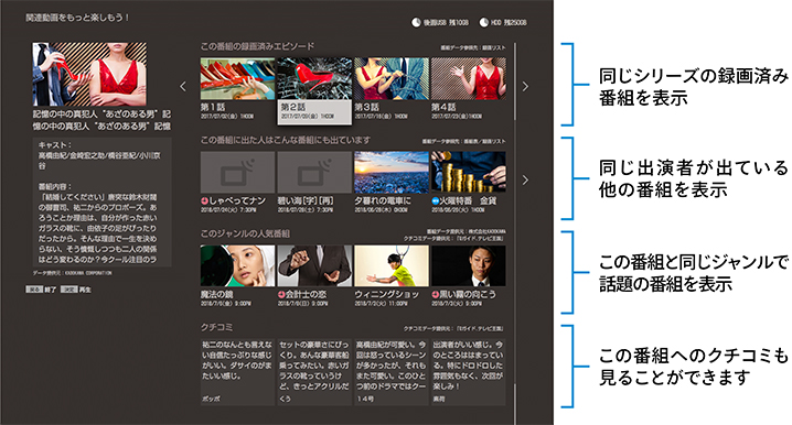 新作ドラマ・アニメの関連情報がわかります。番組ごとの情報ページを自動的に作成。同じシリーズの録画済み番組を一覧表示して再生したり、同じ出演者が出ている他番組、同じジャンルの話題の番組、視聴者のクチコミを表示。
