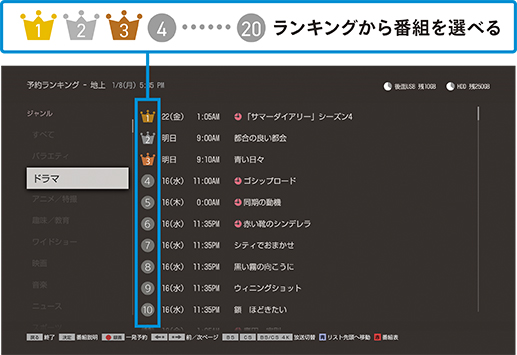 流行りの番組が一目で分かります。最大20位までジャンル別にランキング表示。人気の番組から、気になるものをパッと予約できます。また、リモコンの「4K」ボタンを押せば、4K放送のラインキグも表示できます。